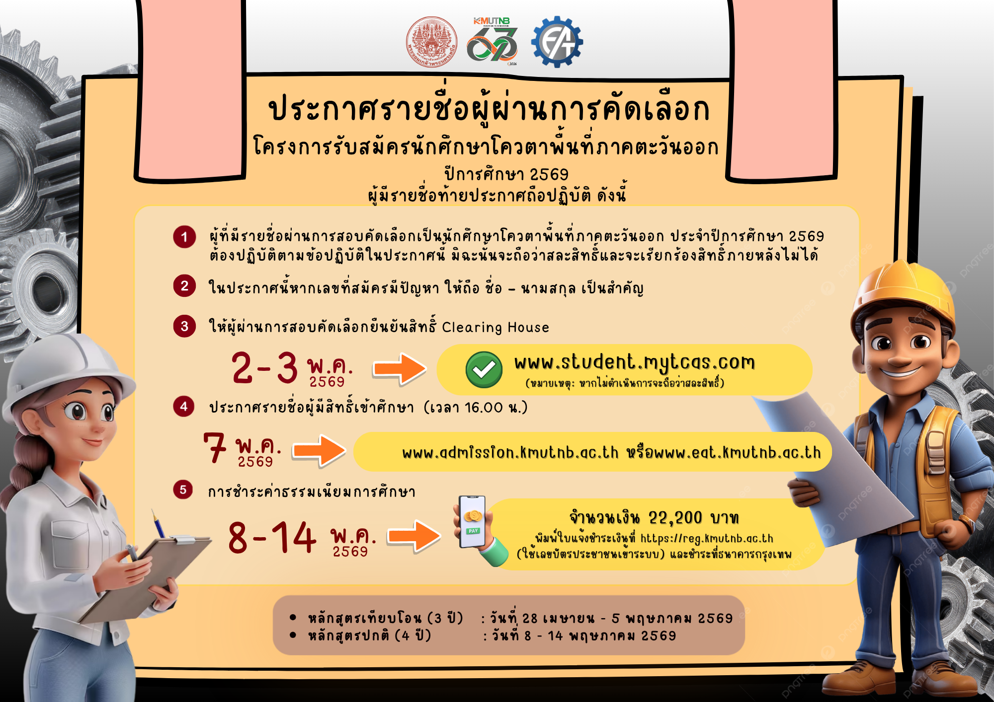 ประกาศรายชื่อผู้มีสิทธิ์สอบคัดเลือกโครงการโควตาภาคตะวันออก ประจำปีการศึกษา 2569 เข้าศึกษาต่อคณะวิศ