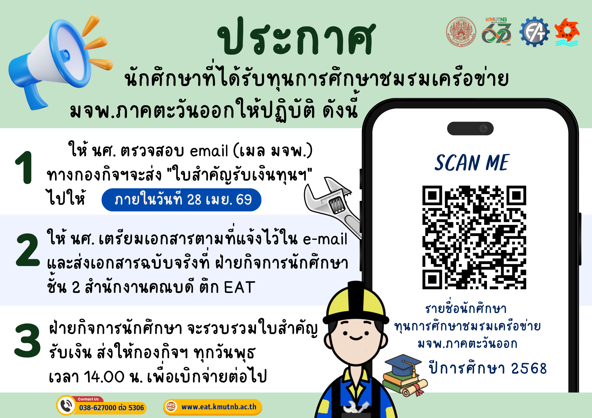 📢 ประกาศนักศึกษาที่ได้รับทุนการศึกษาชมรมเครือข่ายภาคตะวันออกประกาศ นักศึกษาที่ได้รับทุนการศึกษาชมรมเครือข่ายภาคตะวันออก ให้ปฏิบัติ ตังนี้ 1. ให้ นศ. ตรวจสอบ email (เมล มจพ.) ทางกองกิจฯ จะส่ง "ใบสำคัญรับเงินทุนฯ" ไปให้ ภายในวันที่ 28 เมย. 69 2. ให้ นศ. เตรียมเอกสารตามที่แจ้งไว้ใน e-mail และเอกสารส่งเอกสารฉบับจริงที่ ฝ่ายกิจการนักศึกษา ชั้น 2 สำนักงานคณบดี ต View More |